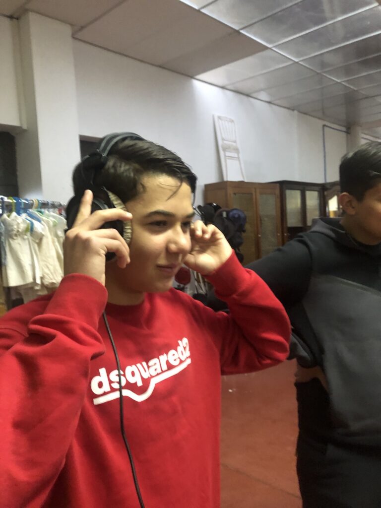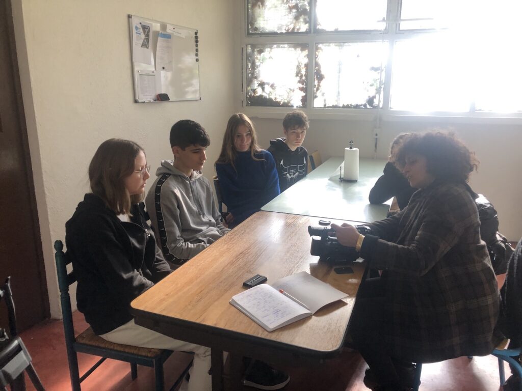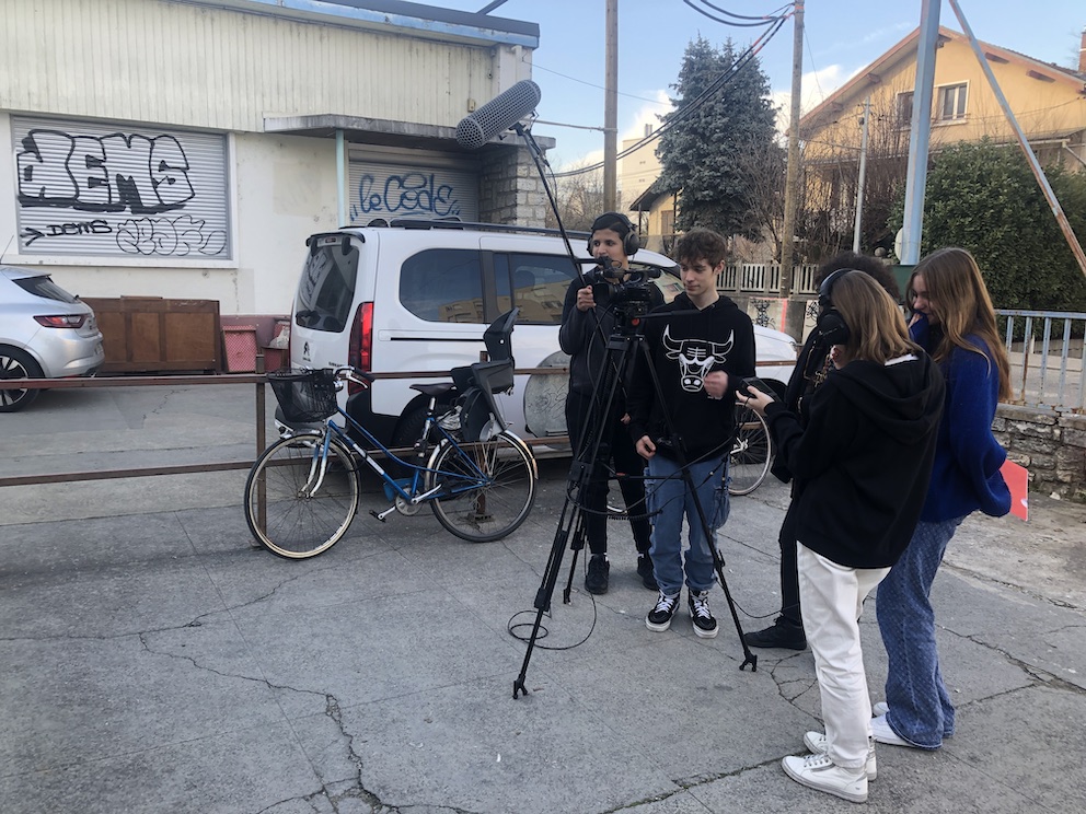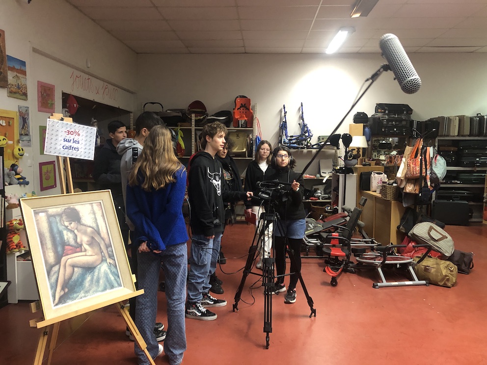 Il s’agissait de prendre en main le matériel pour la première fois et de commencer par des plans fixes, presque photographiques du lieu que nous investissons. Lors de ce tournage, un chantier de démolition se déroulait à l’extérieur et a perturbé notre prise de son à l’intérieur. Nous nous sommes dits que ce n’était peut-être pas un hasard. Après tout, peut-être que ce chantier aurait son importance dans le film. Lucas et Alexine le filmeront au 2ème jour de tournage. Il existera finalement dans notre exercice. Filmer le réel, c’est aussi laisser surgir des éléments du reel. L’univers sonore hors champ en fait partie.