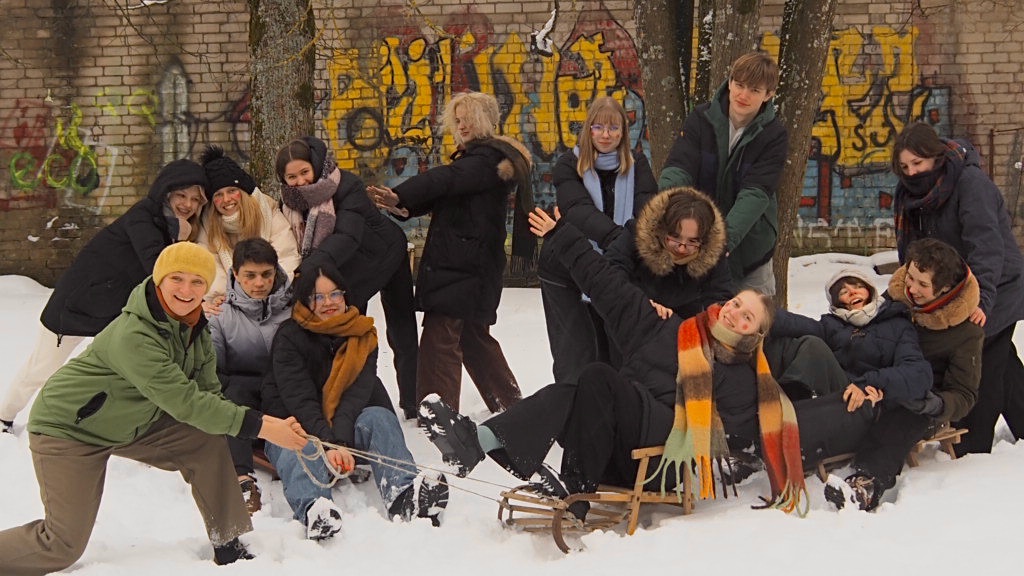 The theme « Film another » will help us watch our surroundings, find it anew, what already appears familiar, in our city. By wandering we will paint our adventure’s trajectory. We will try to speak with the people we meet, listen to their stories. The ducks, living by the frozen river’s bank, invite the city dwellers to listen to their quacks and observe their being. The city’s main bridge and its passing cars create a lively artery for the noise and sight in the city. The church bells echoing loudly overlie the other noises and catch your attention. And we, the Anykščiai Jonas Biliūnas gymnasium student film group, in a gloomy winter day flew in sleds. We delve into the project by befriending each other and filming one another in close up. Exploring, being together, making cinema, finding new friends- is what we expect. We have watched many varying films, we have fulfilled our tasks, learned the basics of film making and we feel as if in a moment our long brewing movie will see the light of day. Only for a single moment- the shining sky, a random sun beam, the flocks of returning birds, the first flowers and the first sprouts of grass – and it’ll finally happen.