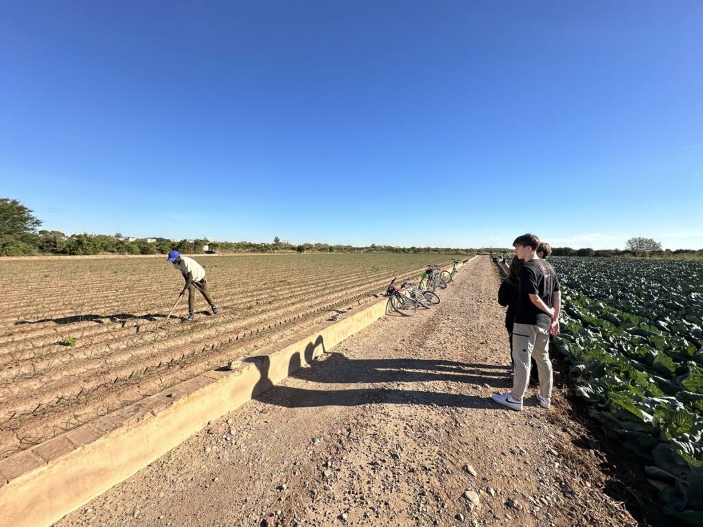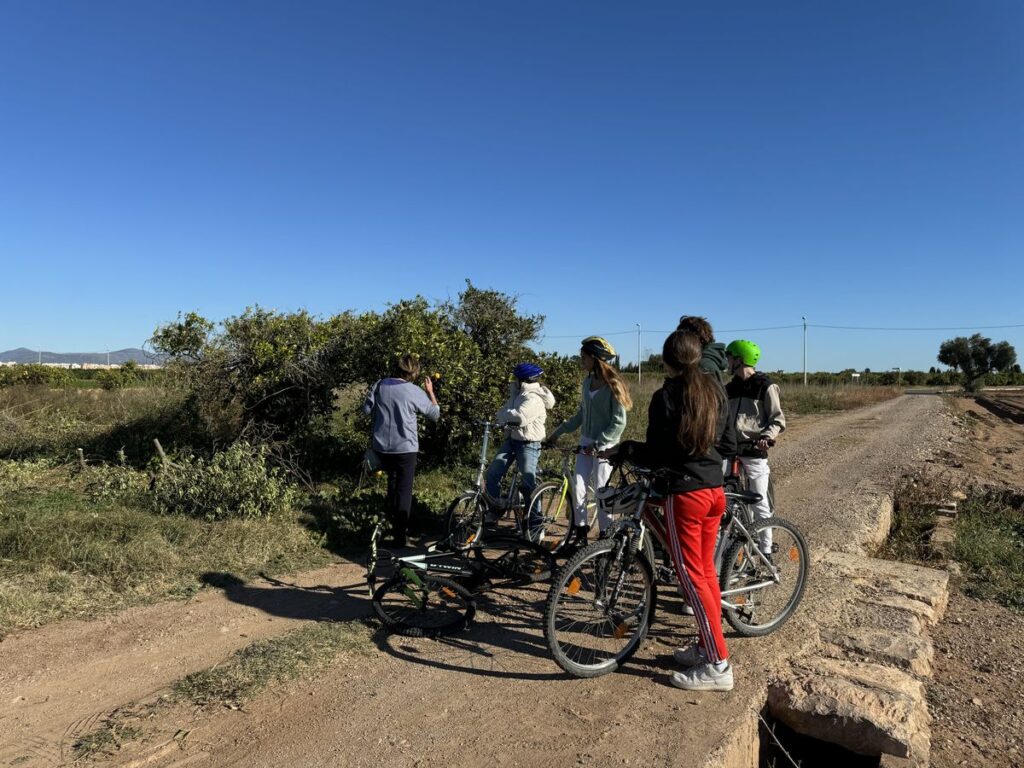 Una altra de les nostres eixides, que ens va agradar molt, va ser anar amb les bicicletes a les hortes per preguntar els treballadors sobre la seua vida a aquest, i així obtindre informació per al nostre documental. Vàrem tindre molta sort perquè per casualitat una de les nostres professores coneixia a una dona, Amparo, que estava fent feines al seu camp amb la seua família, i ens va donar molta informació, com per exemple el problema de les plantes enfiladisses que s’enrotllaven i mataven els cultius, majoritàriament els arbres de taronja, cosa que sol passar quan els camps no es cuiden regularment. Vam voler filmar un pla mentre estaven podant els tarongers. Ens va agradar molt com va quedar el pla, perquè la dona portava un jersey roig i els tarongers eren verds, ens va agradar el contrast.