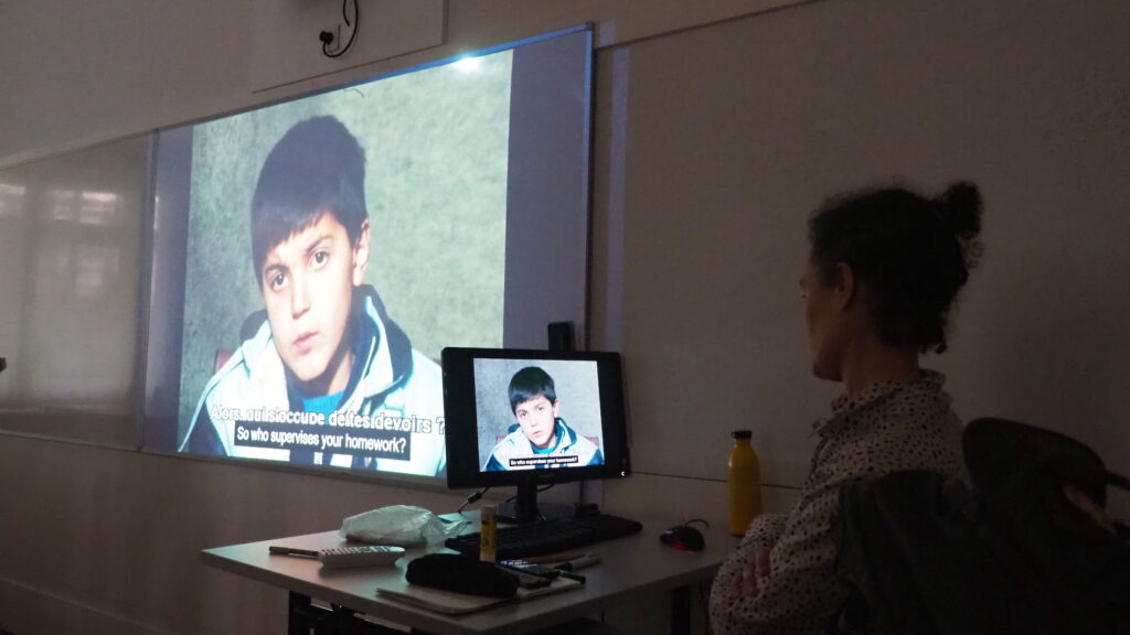In the excerpt from Homework, the device itself is filmed, the team has a dominating position, the man asking the questions, wearing sunglasses, serious, is an authority figure. The questions he asks are the questions that other authority figures would ask: parents, teachers. All the children are filmed in the same way, fixed shots, frontal, centered on the face, long shots in which we see how distressed they are.