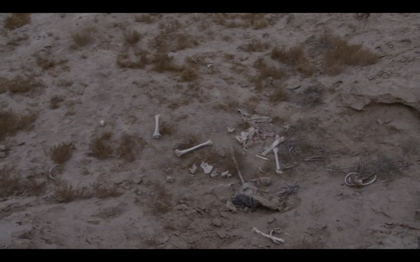 In the excerpt from Les Âmes Mortes, the first part is an interview, a lady speaks to the camera and tells the story of her husband, the second part there are no words, just the sound of the wind and images of a deserted area, we don’t understand very well, and then, at the same time as whoever is filming, it seems, we discover bones, and more bones, and more bones. In a way, it’s the image for the story the lady was telling, but we don’t know the name, the names, of those bones and all we’re left with is a heavy silence, without words.