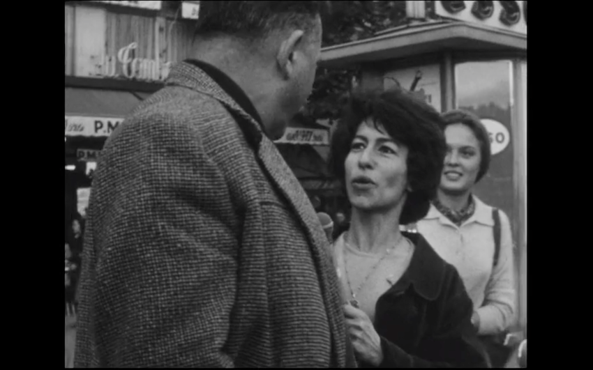 The excerpt from Chronique d’un été asks a single question: are you happy? It’s a simple question, but it’s a huge question, somewhat intimate, and it’s a question that suddenly disarms people. The same question receives different answers, or different ways of answering or not answering. When people accept the question, the survey turns into a conversation and people talk a bit about themselves. The camera is mobile, it follows the interviewers and the reaction of the interviewees.